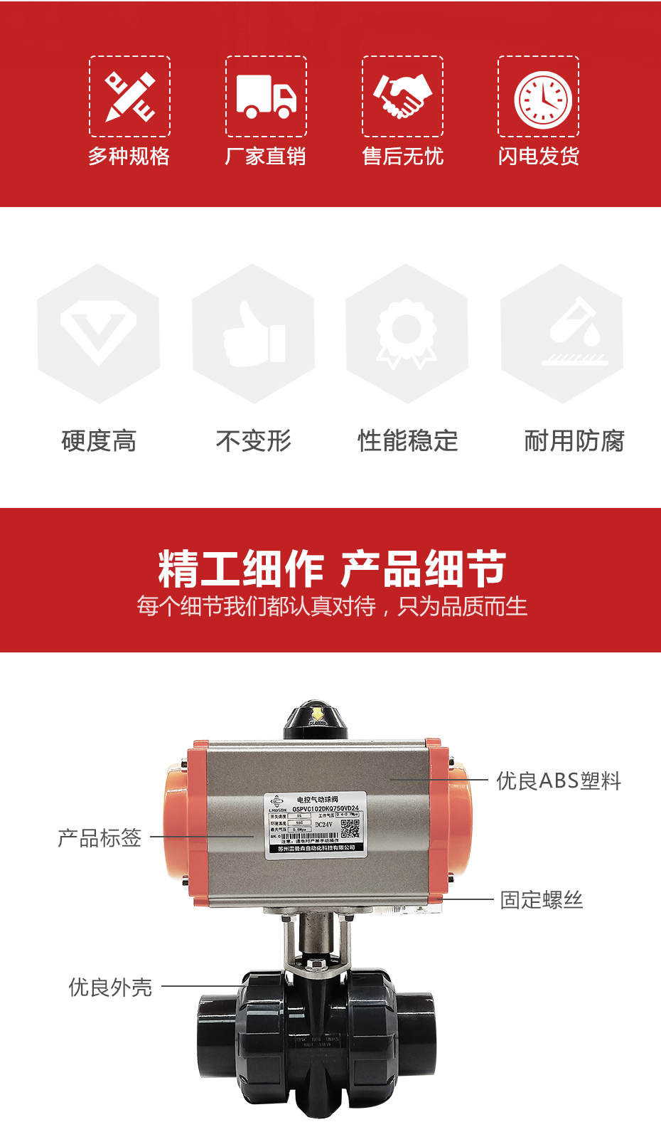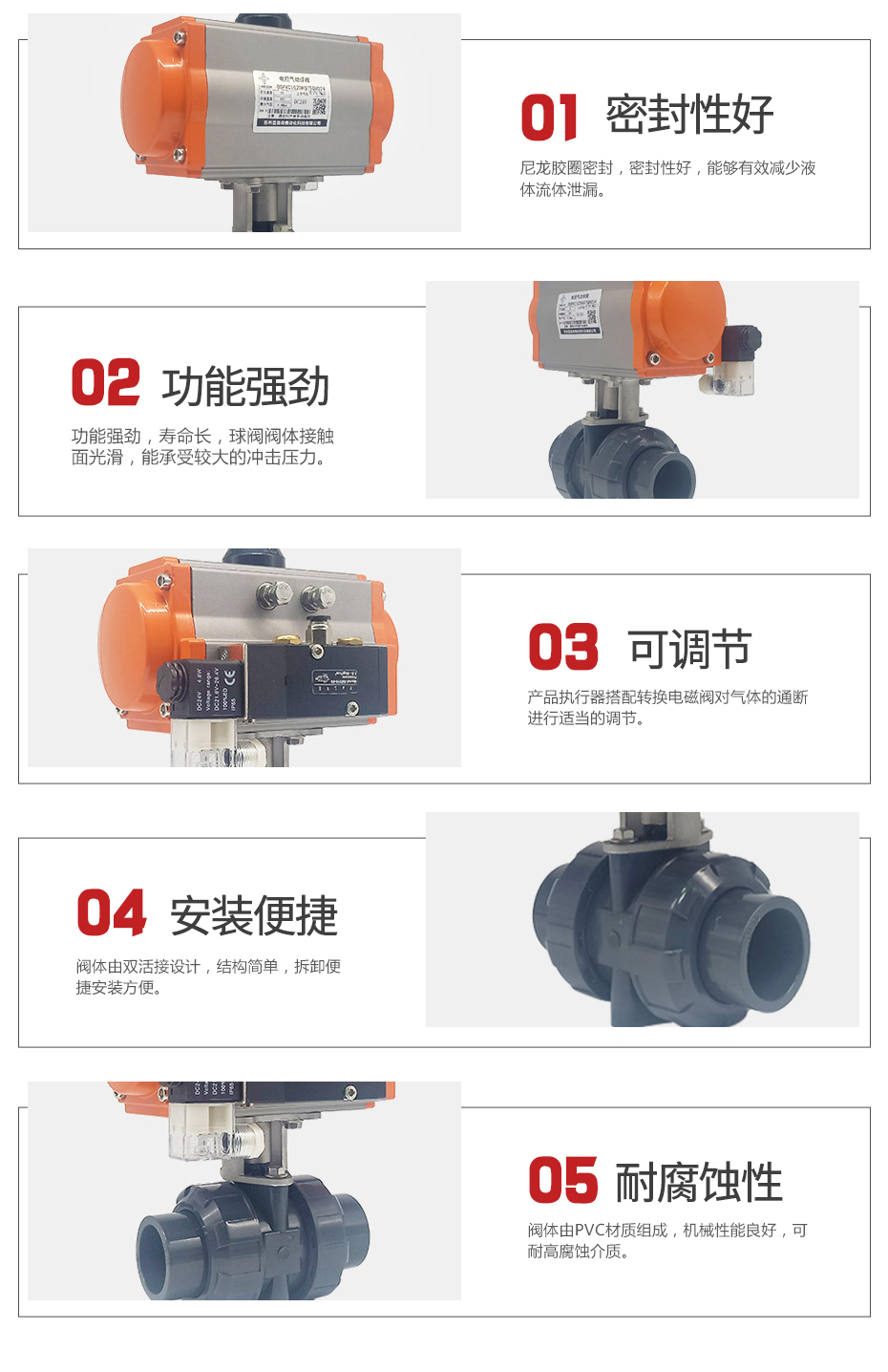 产品特点和优势:双活接设计,结构简单,拆卸便捷安装方便,阀体为PVC材质,耐腐蚀抗酸碱,机械性能良好,抗拉伸强度高,内螺纹承插连接,磨损小,使用寿命更长,产品内部由尼龙胶圈密封,密封性好,无液体流体泄漏,阀体各处衔接良好无液体残留泄露,安全可靠,产品执行器搭配微型电磁阀智能气体的通断进行适当的调节,外壳由铝合金板块打造,能更好的减少电磁的干扰,耐磨损,更加美观大方。